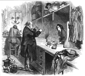 Like the PRINCE OF FENCES, this pawnbroker in Victorian England inspects goods for sale.